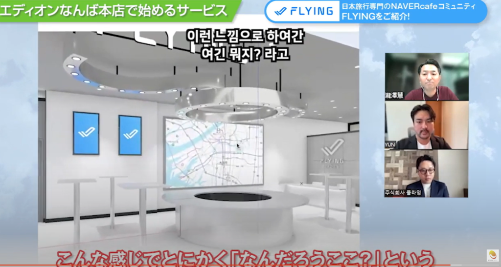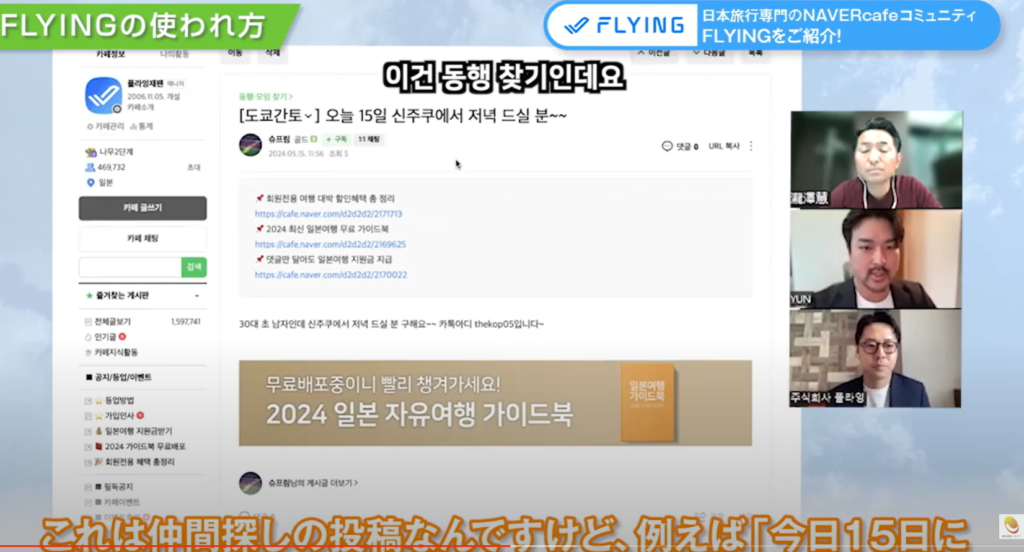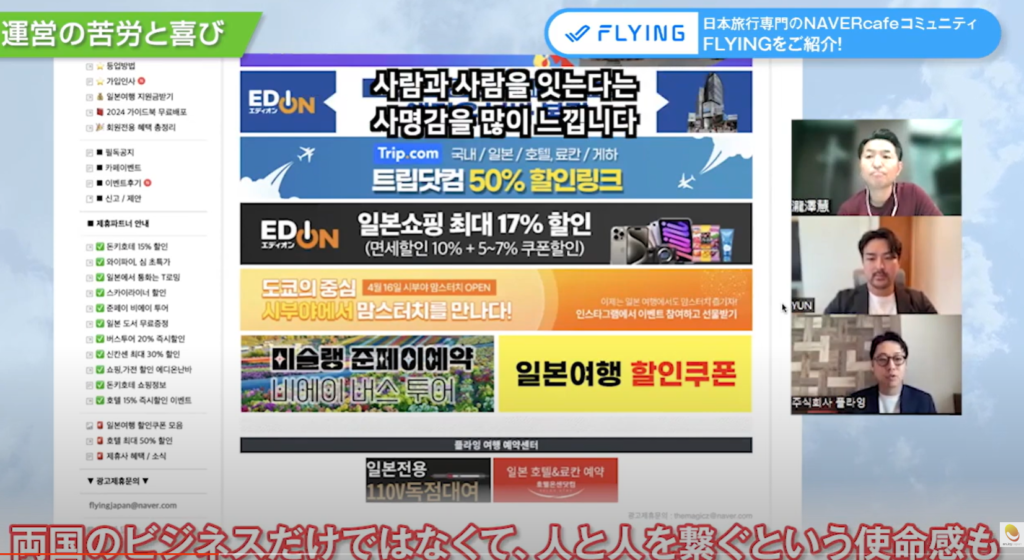 シンさん:『FLYING(FLYING JAPAN)』は、韓国で約58万人の会員を持つ、我々FLYING(韓国企業)が運営する日本旅行に特化したオンラインコミュニティサイトです。LINEでお馴染みのNAVER社が運営するオンラインコミュニティとカカオトークチャンネルを通じて、日本の全ての旅行情報を提供しています。また、様々な日本と韓国の企業様との連携を通じて、マーケティングや宣伝広告を展開し、多くの実績を積むとともに会員様への特典やプロモーション提供のための商品開発を行っております。