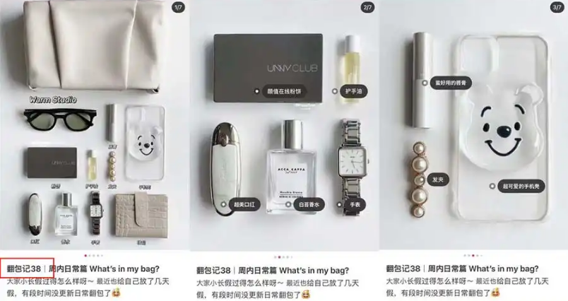 カバンの中を紹介する投稿は小紅書の人気のある投稿の1つです。他人の生活や持ち物に対して興味を持つユーザーが多く存在します。私物品を紹介する投稿は広告っぽさがなく、複数の商品の魅力を伝えることができます。