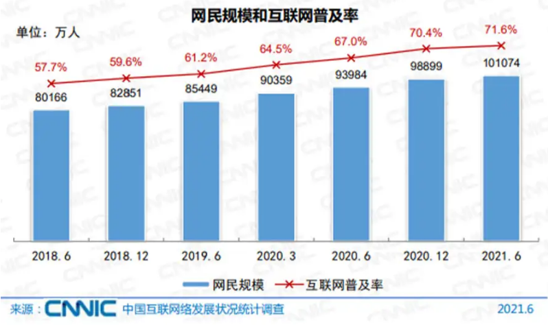 中国のインターネット利用者、WEBサービス利用者は2021年6月時点で10億人以上に達しており、以前のような10%を超えたような成長は見込めなくなり飽和していきていると言えます。