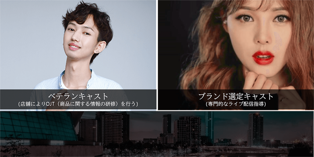 - ライブ配信のキャストは2種類から選択できる。1つはベテランキャスト、店舗により商品の研修を行う必要がある。もう一つは、ブランド側がキャストを選定し、専門的なライブ配信指導を行うことである。両者とも審査を通過したら業務に従事できる。
