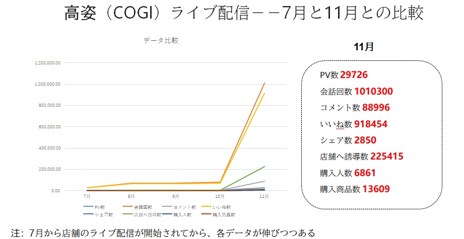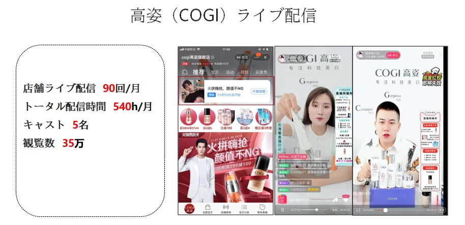 COGI(高姿)は香港で創業し、現在30年以上の歴史をもつ化粧品メーカーである。ライブ配信のキャストは5名で、月平均90回のライブ配信を行い、閲覧数は35万に達した。2019年の7月スタートしてから各データ、特にいいね数と購入商品数が伸びつつである。