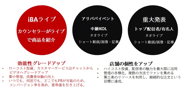 また、アリババのイベントで有名人やKOLなどと連携して生中継することもできる。普段のカスタマーサービスをチャットから映像にグレードアップ、いつでもどこでも何回でもPRすることができる。従来のカスタマーサービスをiBAに変えた特徴は、1人2役、カスタマーサービスでありながらライブ配信者でもある。また従来のサービスの型を破り、カスタマーサービスの在り方を刷新。それにテキストサービスからビデオサービスへグレードアップ。サービスのアップグレードにより、客単価アップへの期待が大きい。