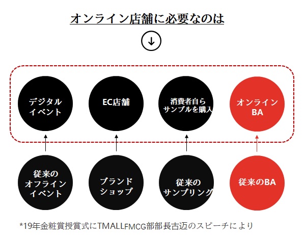 これはTMALLのFMCG(Fast Moving Consumer Goods)事業部の部長古邁氏による2019年のTMALLビューティアワードでのスピーチである。科学技術の発展によるモバイル技術の発達により、人々はライブ配信や動画で買い物する傾向が強まっている。5Gが普及すると、消費者はモニター越しでも商品の良さを目で確認することができるようになる。EC市場の発展と拡大に伴い、ブランドのオンライン化も促進した。ブランドのオンライン化に必要なのは高度な店舗運営能力。例えばオフラインイベントからデジタルイベントに、オフラインショップからECに、従来のBA(ビューティーアドバイザー)からオンラインのBA、つまりiBAに……。