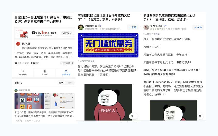 「○○プラットフォームの○○店舗がいい」、「この代理購入は信用できるのか?」など、商品を購入する前に、プラットフォーム、店舗、商品を比較検討する際に知乎を使う人も多くいます。(事例17参照)
