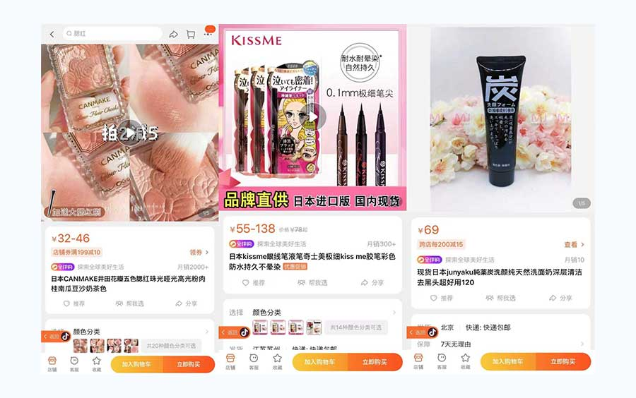 「何かを調べる」というよりは、ユーザーがフォローしているKOLの最新作やトレンドになっていることを知るためのツールになっています。また、小紅書と同様に、アルゴリズムにより自分の興味がありそうな動画が次々に出てくるので、メイクの動画をよく見るユーザーは、メイクの動画が次々に表示されて商品を認知します。(※事例5参照)