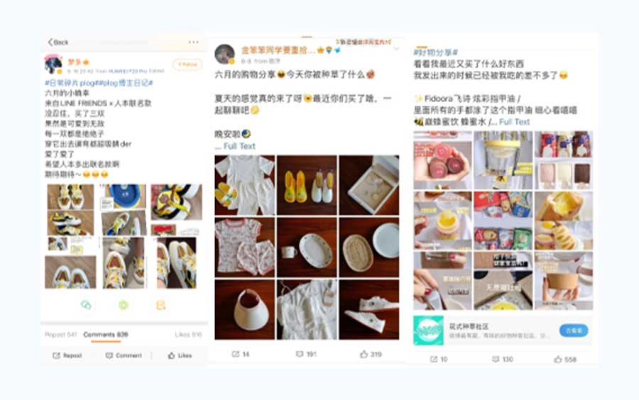 商品を購入し、購入した商品の感想をシェアするプラットフォームは、小紅書が圧倒的に多い状況です。投稿内容は多岐にわたっており、商品の使用方法から成分まで天猫の販売ページ(天猫の販売店舗など)よりも詳細に発信するユーザーもいます。