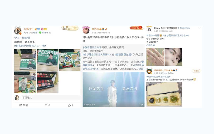 その他、ファンの芸能人が宣伝している商品を購入して、『同款(芸能人と同じ商品を購入したこと)』をファンの間でシェアする。芸能人〇〇さんが紹介していた有名企業〇〇の新商品かっこいいよね!早速コーディネートしてみたよ!などというような投稿をします。