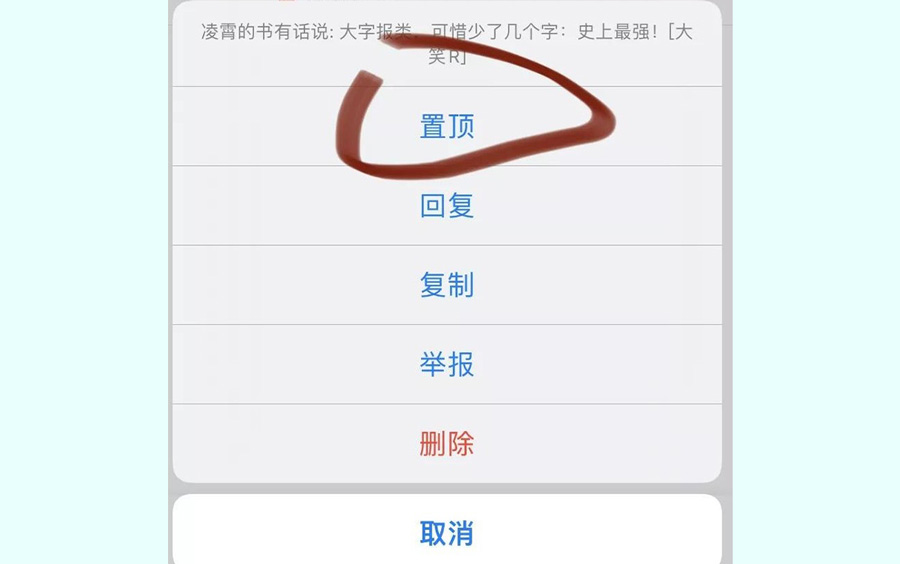 メニューの一番上に「置顶」(一番上に固定すること)のボタンを押すと選んだコメントは常にコメント欄の一番上に表示されるようになります。