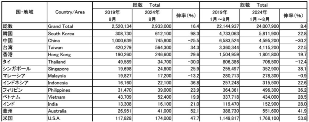 JNTO・日本政府観光局によると、2024年8月末時点での訪日韓国人観光客数は約580万人で、国別訪問者数で第1位。消費金額も2024年4~6月の3か月間で約2,232億円と、高い経済効果を生み出しています。全体では中国、アメリカ、台湾に次ぐ4位となっています。