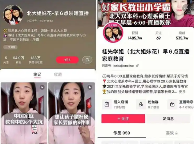 小紅書で「親子教育」、「心理学」などのコンテンツを発信している@北大姐妹花というKOLは、最近急速にフォロワーが増加しています。現時点でのフォロワーはすでに53.2万人を超えていますが、彼女のアカウント名の末尾には、「朝6時Douyinでライブ配信」と書かれています。