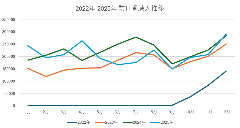 JNTO(日本政府観光局)が発表した2026年1月21日の最新資料(2025年12月推計値)によると、2025年1月〜12月の累計訪日香港人数は約251万人に達しました。2025年の訪日外客数全体が過去最高の約4,268万人を記録する中、香港は韓国、台湾、中国、米国に次ぐ主要市場としての地位を確固たるものにしています。