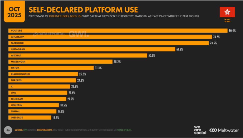 SNSの利用状況について、DataReportalが2025年10月に実施した調査では、香港人の73.5%がFacebook、61.2%がInstagramを使用しています。