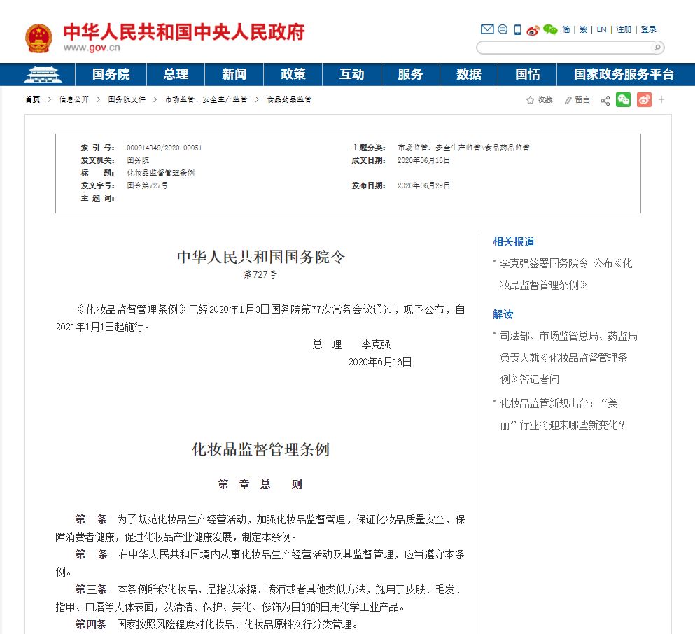 新たに制定した『化粧品監督管理条例』は2021年1月1日に発効することを中国の国務院総理である「李克强首相」が発表しました。
