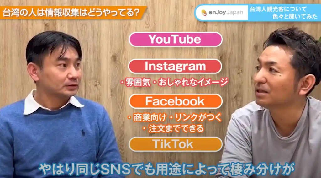 ーー台湾の多くの人たちが日本に何回も訪れていて日本に詳しい方もたくさんいらっしゃると思うんですけど、例えば日本で行ったことのないような観光客があまり知られていない地域に出かける際、事前に情報を収集すると思うんですが、日本の情報を収集する際どのようなメディアを使って情報収集してるんですかね?