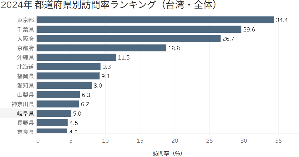 この2024年の訪日台湾人における都道府県別訪問率を見ると、東京・千葉・大阪を中心とした「王道ゴールデンルート」への集中が非常に強い構造が確認できます。