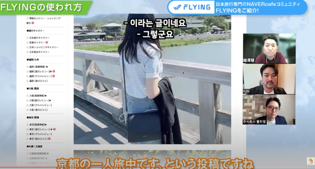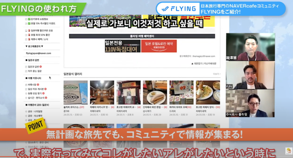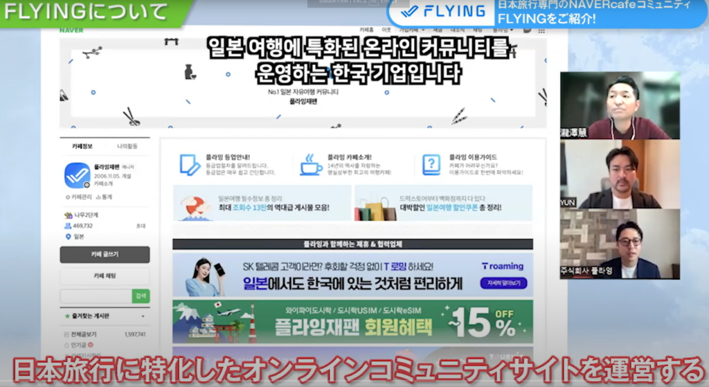 シンさん:『FLYING(FLYING JAPAN)』は、韓国で約58万人の会員を持つ、我々FLYING(韓国企業)が運営する日本旅行に特化したオンラインコミュニティサイトです。LINEでお馴染みのNAVER社が運営するオンラインコミュニティとカカオトークチャンネルを通じて、日本の全ての旅行情報を提供しています。また、様々な日本と韓国の企業様との連携を通じて、マーケティングや宣伝広告を展開し、多くの実績を積むとともに会員様への特典やプロモーション提供のための商品開発を行っております。