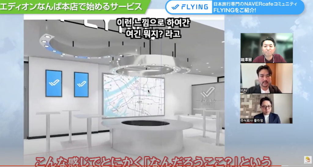今回はゲストの方をお迎えしております。韓国企業の方をご招待しています。韓国のFLYING社の代表取締役のシンさんとファウンダーのユンさんにご登場いただきました。多くの韓国人観光客が利用する『FLYING JAPAN』についてお聞きしましたのでご覧ください。