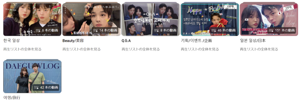 日韓カップルのデートvlogや日本の文化、日韓の違い、留学生活についてなど韓国人の視点からみた日本をわかりやすく投稿しているため、参考になる動画が多いです。小学生のときに日本に来たとのことで日本語がとても上手です。韓国人だけではなく日本人からも人気が高いのが特徴です。