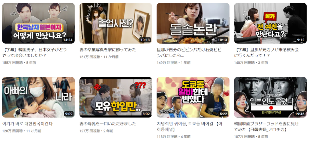 東京に住む日韓夫婦、韓国人の旦那さんと日本人の奥さんによる日常生活の様子を赤裸々に教えてくれています。二人の両親も動画に参加することもあり、普段ではなかなか知ることができない日韓夫婦の問題等も見ることができ魅力的です。