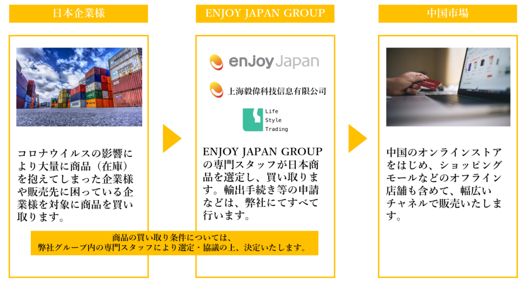 コロナウイルスによるインバウンド需要減などの影響を受け、販売に困っている日本企業(日用品・化粧品メーカー、流通小売)の商品を当社の専門スタッフが選定し、中国ニーズがある商品を買い取ります。買い取った商品は、ENJOY JAPANグループにて主に中国に輸出いたします。輸出した商品は、中国国内のショッピングモールをはじめ、小売店舗、オンラインストアなどで販売いたします。