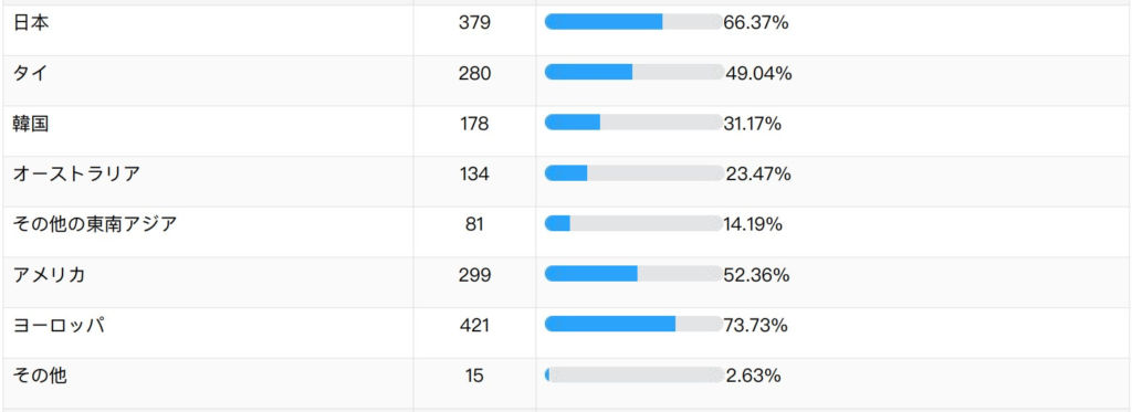 ヨーロッパが最も高い73.73%ではあるが、ヨーロッパは、フランス、イギリス、イタリア、スペインなどの人気エリアを含んだ合計のため、国別で見ると日本が最も高い。