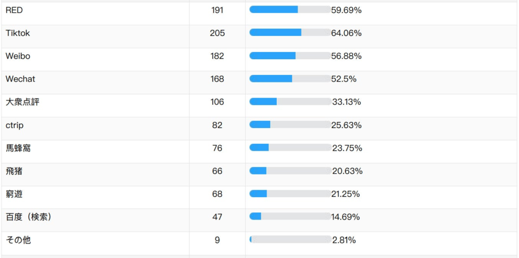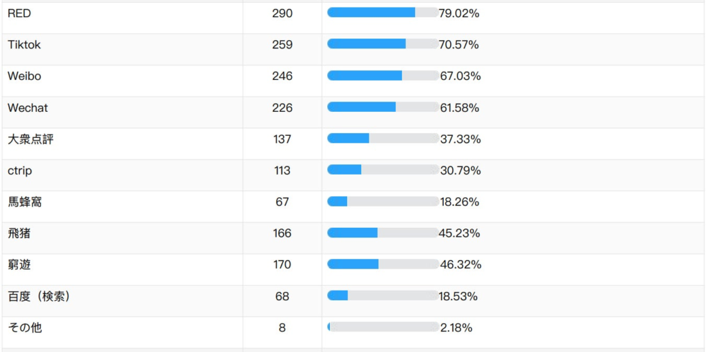 RED(小紅書)が約80%でNo.1プラットフォームに。観光分野でもWeibo(ウェイボ/微博)は、3番手メディアに陥落