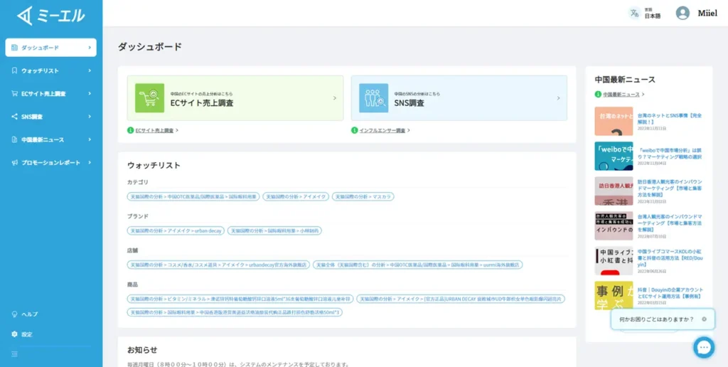 ミーエルは、中国市場の分析を行うマーケティングシステムです。中国ではデジタルがマーケティングの中心になっており、日本以上にEコマースでの販売が普及しております。その結果、中国市場を理解し戦略を立てるにはSNS・ECのビッグデータを分析することが必須事項となりましたが、外部の調査会社などに毎回委託をするのではなく、中国が分からなくても中国のSNSデータ、ECの販売データを分析することができるようにしたマーケティングツールです。